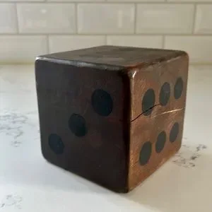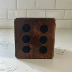 Crate&barrel Rustic Oversized Wooden Dice. Add a playful energy to your desk, bookshelf or mantel with this oversized die. Handcarved by skilled artisans, mango wood shapes a softly rounded cube. The natural finish highlights the fine woodgrain, adorned with a series of black dots in familiar configurations. A winky gift for a game night companion, our exclusive oversized wooden dice is classic yet fanciful. Hand-carved. Mango wood with natural finish. Approximately measurements: 4" sq. x 4"D. Please see all pictures for conditions. Brand new with tag