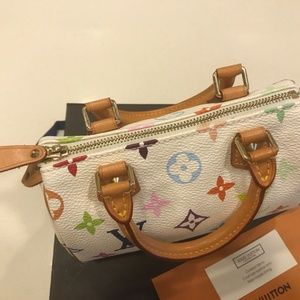 Louis Vuitton Takashi Murakami White Multicolor nano speedy bag, it was one of the bag collection pieces from multicolor. Extremely hard to find Vintage piece. Original card certificate, lock and keys attached to the bag. Rare collection piece for bag collectors.