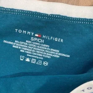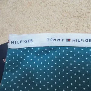 Teal (green- blue) with polka dot pattern with elastic at top that has Tommy Hilfiger written on it