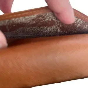 Inside pockets has rubbing, some wrinkling, and one side the leather is detached