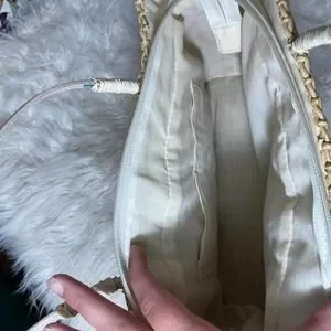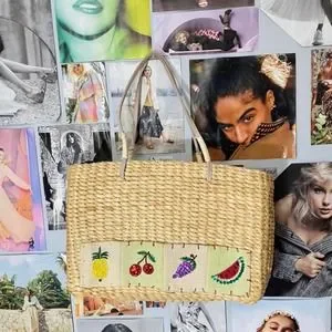 The most adorable woven bag with cute little fruit stitched to the front! This would be perfect for a little picnic date or a summer day out and about! In great condition with minor wear and tear on the bottom. 13” across