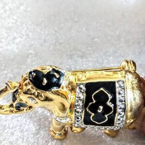 2 1/2" Crystal and Black Enamel Gold tone Elephant Brooch. Stunning Brooch has Crystal Eyes Black Enamel Cover and Hat and is covered in gold tone. This Item is in good condition.