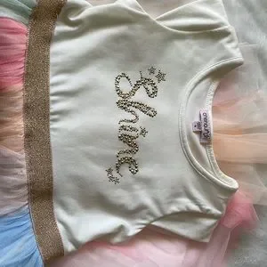 Size 6 creamy white top “Shine” written in gold and silver gems. Great condition, soft tulle with lining underneath.