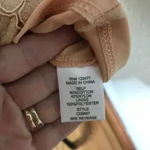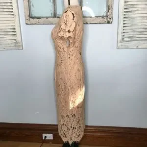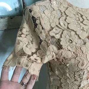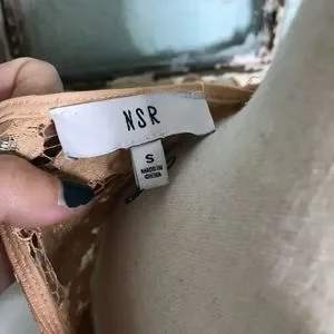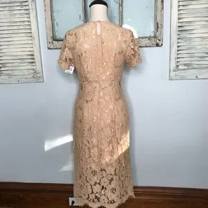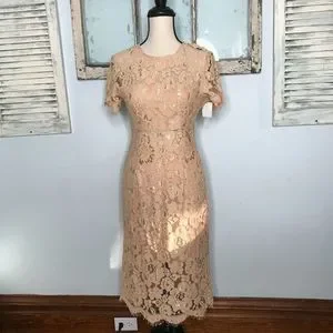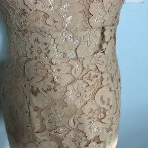 Absolutely beautiful size small Champaign colored lace dress by NSR. With gorgeous scalloped, delicate lace hems around the arms and bottom of the dress. Delicate functional back keyhole style button closure with functional hidden side zipper. This is a perfect dress for a bridal shower, rehearsal dinner, engagement party, or other special occasion. Pictures really do not do it justice. It’s new with tags and has no known flaws. Comes from a smoke free home.