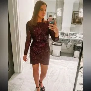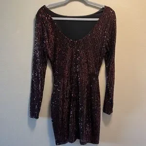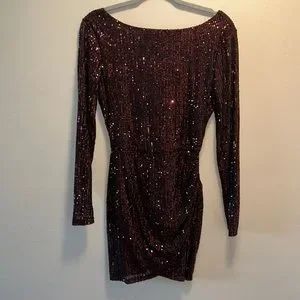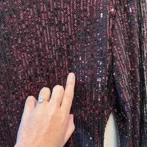 Red sequined dress. Form fitting with slight gathering near stomach. Sleeves are see through but body of dress is lined. Does have some stretch. Zipper in back. Lots of sparkle. Worn once to a holiday party. A few sequins are missing which is shown in picture.