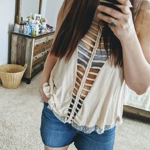 Almond colored boho braided detail tank! Wear with your favorite bralette or over your Bikini top this summer! Soft jersey fabric with cute lace hem detail! Runs a little oversized due to style. Fabric is 94% Rayon and 4% spandex.
