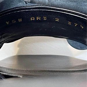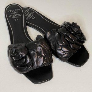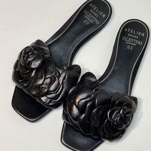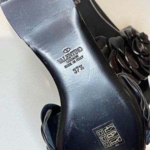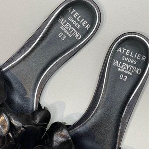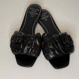 Slip-on calfskin sandals in black. Open square toe. Tonal graphic appliqué at vamp. Stacked leather heel. Tonal leather sole featuring rubber injection at heel. Part of the 03 Rose Edition Atelier within the Valentino Garavani collection. Color: Black Size: 37.5 Calfskin. Made in Italy. Condition: Like New No box or dust bag