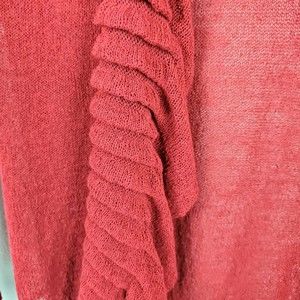 Beautiful Eileen Fisher open-front cardigan sweater. Color is burgundy/maroon. Ruffled pleated front detail. Long sleeves. Lightweight.