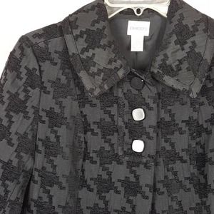 Chico's swing coat, black with a geometric design, 3 button closure at the neck, collared, 2 pockets, long sleeve, fully lined.