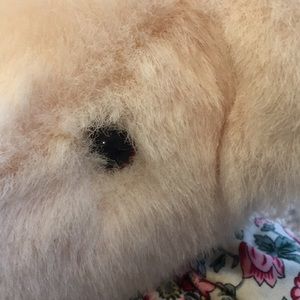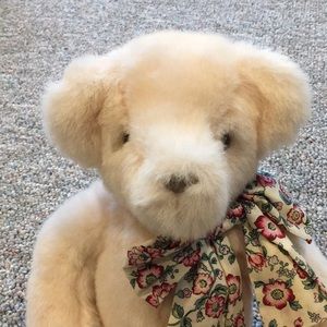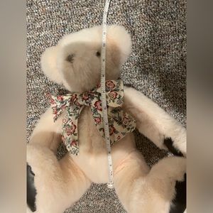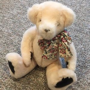 EUC. Light pink Gund bear with floral bow around neck. Black leathery feeling paws. No rips or stains. Very cute! Add to a collection or cute toy for kid. Ask questions.
