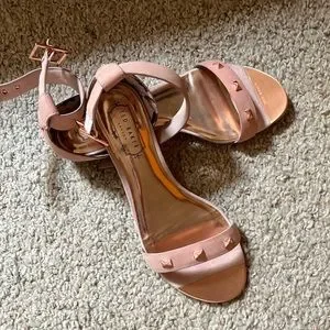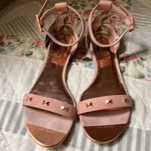 Beautiful pink blush Ted baker sandals. Excellent condition only worn once. Pink suede leather with rose gold Ted Baker. signature bows on front of shoe. Super cute !! Wear with dresses or dress down with jeans. Great color for all year round.