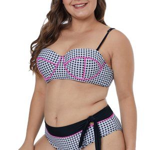 Dreamkue White Contrast Piping Tartan Printed Pattern Plus Size Bikini