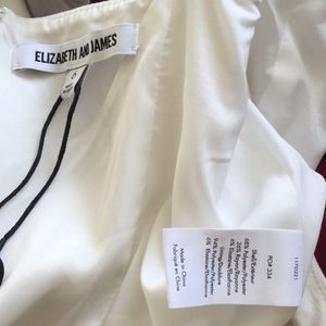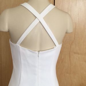 A sophisticated Elizabeth and James dress in a slim silhouette. Raised stitches accent the seams, and the banded scoop neckline is finished with crisscross straps at the open back. Side slit. Hidden back zip. Lined.