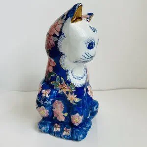 Vintage Hand Painted Porcelain Decorative Blue Sitting Cat Figurine 8”