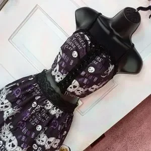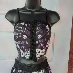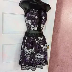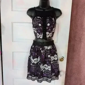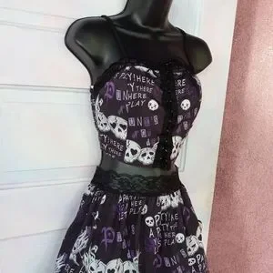 this cute as fork creepy cute/ punk rock/ kawaii goth skirt set has a lace up corset crop top, tank style, with lace and adorbs party skull purple and black aesthetic and lace trim! matching skirt zips up back, no stretch! XS waist is 12 inches flat, S waist is 13.25 flat! runs slightly small, I'd say, but not by much so pls see above measurements! sooooo forkin cute, sold out online FAST last season in romwe, what they call "deadstock" now days but means discontinued. pics show skirt with tutu underneath (not included, one i own but any will work that you own!) and also without tutu. pls view pics carefully as they're a part of the description!