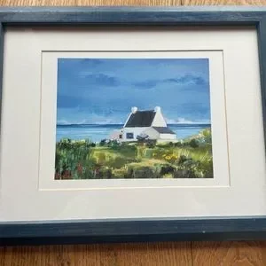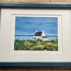 Unique Cottage by the Sea Scene Print Blue Frame 19” 14”