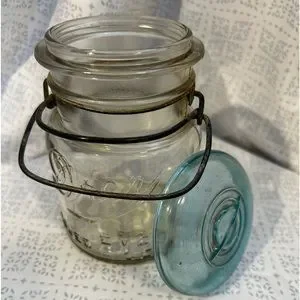 Vintage Drey improved ever seal glass canning jar w/blue lid and wire closure. Missing the rubber piece.