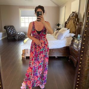Beautiful tropical print summer dress with straps and a drawstring under the breast to adjust the waist, the dress has 2 slits in the front. unfortunately I cut the inner label..