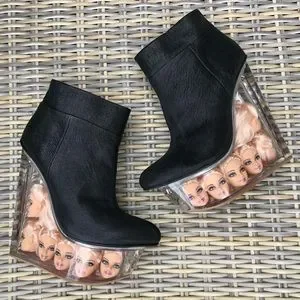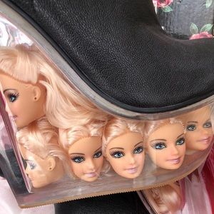 This is an an amazing pair of impossible to find Jeffrey Campbell boots in a size 8. These have a platform clear heel with Barbie heads implanted in the soles. Pebbled leather upper. New in box.