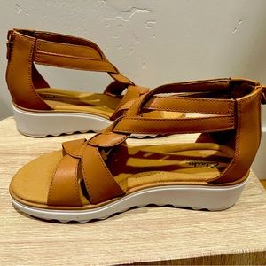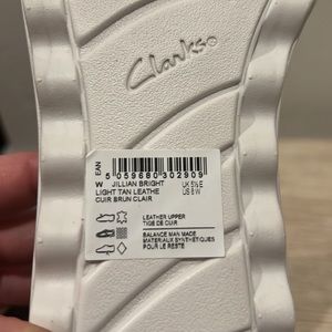 Clarks Tan Leather 8W, chic leather sandal. Brand new. Grippy flex grooved sole, ortholite footbed. Closed heel silhouette.
