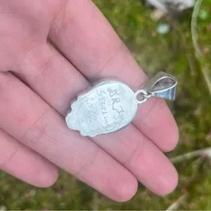 A new pendant design hand made by David freeland jr. Sterling silver stealie pendant with a Wolf themed gemstone inlay design. Matching bail piece up top really makes this piece POP! Made with genuine gemstones and lab grown opal