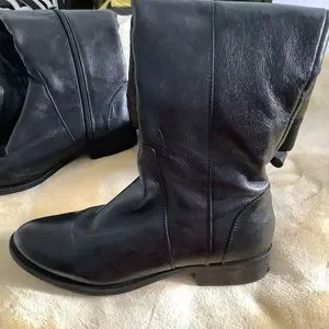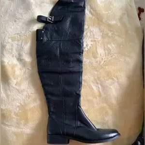 Gently worn over the knee flat boots. Half length zipper at inside calf. Buckle strap at top. Calf 14 in., thigh 16 in., length 25 in. One in. heels. Sole length 10 3/4 in.