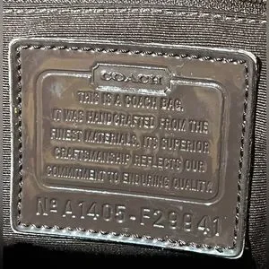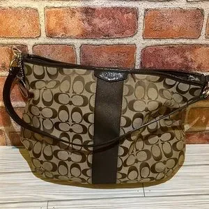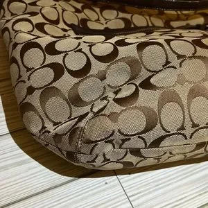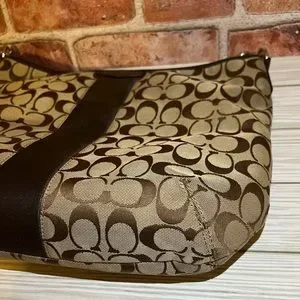 Authentic Brown Coach Purse. Very lightly used. I didn’t carry this often. The brown stripe down the middle has some shimmer in the fabric, can’t really tell in the photos. The main area where you can tell there is wear, is the strap, the material must has gotten very dry. Photo is attached so you can see.