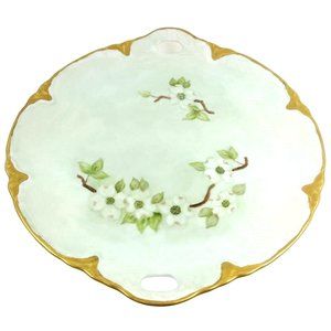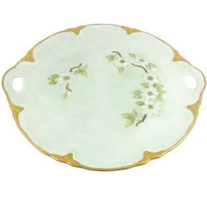 This Serving Plate Ceramic Platter is hand-painted with stunning dogwood floral graphics and signed by Effie Taylor. The platter is multicolored and includes handles for easy serving and is a slightly oval shape.