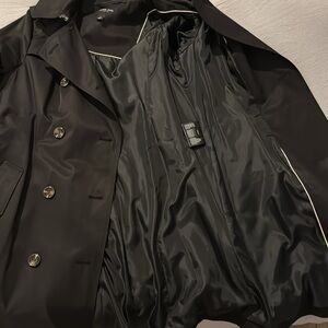 Brand new black London fog trench coat, hood removable, double breasted, belt. Size women L