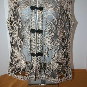 A gorgeouse Asian-made black and gold soutache ribbon stitched over a black net lace vest. Closes with 4 black Chinese knot frog button closures. Gold henley stand up collar. My guess is size is small/medium. Chinese designer label Jin Xiu, (possibly known as Jin Xiu Lang).