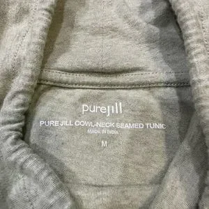 Pure Jill size Medium cowl-neck tunic Pale green with drawstring. Small pin size hole in armpit area on one side. Measurements and care details in pictures. Flaw pictured