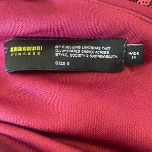 Finesse’s Joelle shimmer one shoulder mini dress. Ruched all the way down the back and on the sides so you can adjust the length of the dress. Deep red wine color