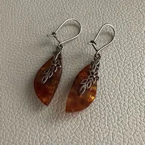 Genuine amber and sterling silver earrings with floral design. Gorgeous fire to the stone when in the sunlight. Stamped 925.