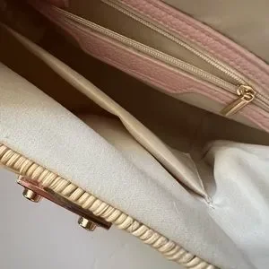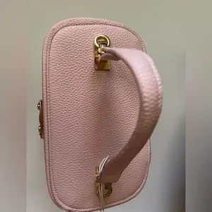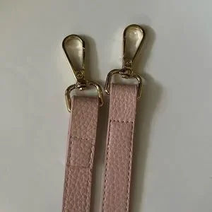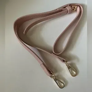 It comes with a 44” leather shoulder crossbody strap and has the bucket handle. The pink color is a beautiful, soft shade - perfect for spring and summer!