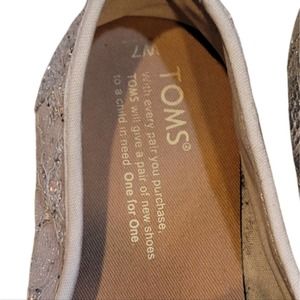Beautiful Toms in a silvery floral lace with sequin-like accents. Background is a light, kinda taupe color.