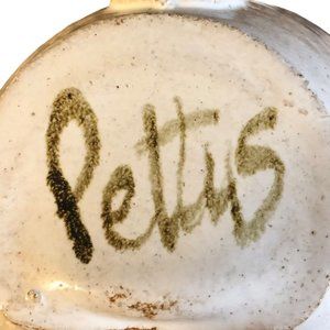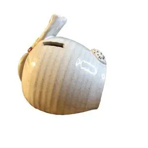This charming vintage pottery stoneware coin bank is by artist JOHN PETTUS, known for his whimsical folk art designs, especially of animals. This bank is in the form of a bunny rabbit with two large front teeth and the cutest expression on its face! The back of the bank is signed "Pettus," which adds authenticity and value to the piece. It also includes its original stopper and features a beautiful glossy glaze. It has a sanded and unglazed base. This coin bank measures 6 inches from nose to tail, 6.5 inches in height and 5.75 inches in width. Pettus is known for creating silly and collectible animal-shaped banks, among other pieces, and this bunny rabbit is no exception. It will make a delightful addition to any pottery or animal-themed collection.