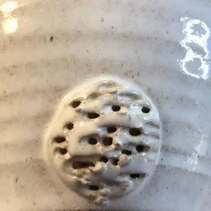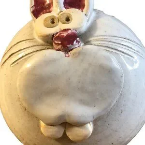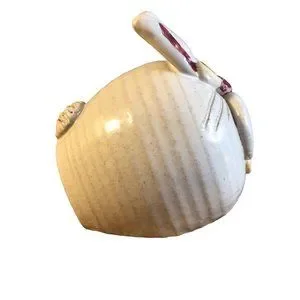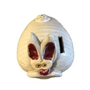 Condition: This vintage John Pettus bunny rabbit bank is in excellent condition, with no chips, cracks, crazing or repairs. The pink coloring of the nose and ears is a little splotchy but the glaze is still intact, so this was likely part of Pettus' original design.