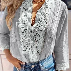 New Grey Lace Button Front Blouse Top Bohemian Western Dress Causal Vintage