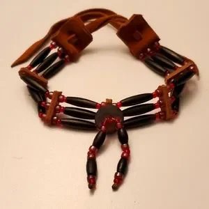 Handmade piece, ties at the back with soft tan leather thongs. black and red beads. Lovely piece that I've only worn a couple of times, gifted to me originally by someone with Native American heritage.