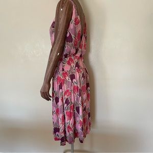 Fun and bold, floral print silk jersey knit dress. Deep v-neck in front and back with a vintage-looking drop waist. Very comfortable fabric. Used but in good condition.