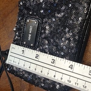 Black small sequin crossbody bag. 3 sections, middle section coin purse. Great for an event or evening out. Great condition