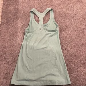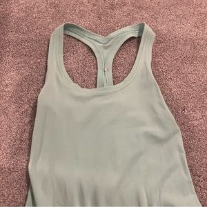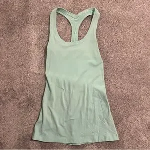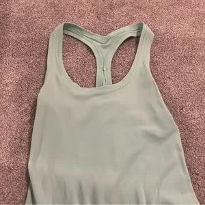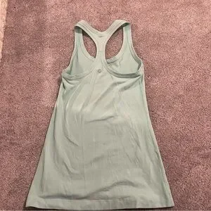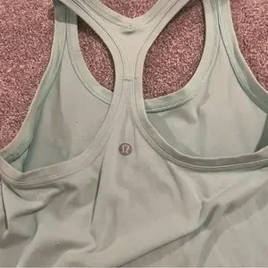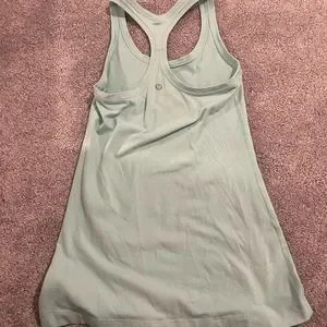 super cute light teal racer back tank top size 4! color is closest to the first photo( the other photos aren’t showing it as vibrant as it is in person) it is a light soft teal color. no snags or tears, barely worn