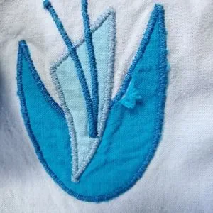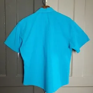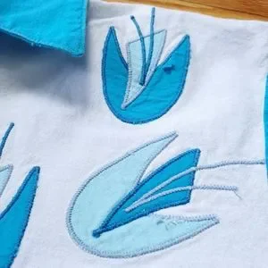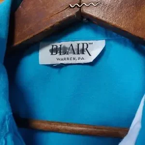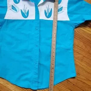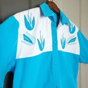 Unique atomic floral pattern and bright blue color on this vintage button down shirt from Blair! Fabric tag is missing but feels like 100% cotton. Has been machine washed. Applique has slight fray on the left side which is shown in photos. No holes, stains or odors. Incredible find! Please see photos for measurements and details.