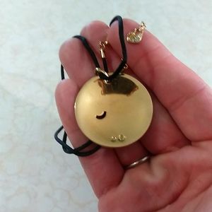 Genuine Swarovski black crystal and Goldtone necklace.Black silk cord with lobster claw clasp with some adjustability in length.The pendant has a random unique pattern and is a solid piece.Pictures really do not give this necklace justice.Worn for a wedding.I prefer white metal over yellow.Reasonable offers Welcome.