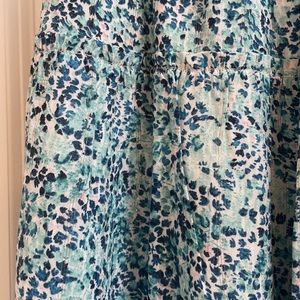 Soft blues and greens in the floral pattern of this tiered mini skirt from LOFT, with some silver metallic threads woven in, too. About 18.5” from waist to hem. Elastic waist, lined. Lightweight and perfect for spring and summer!
