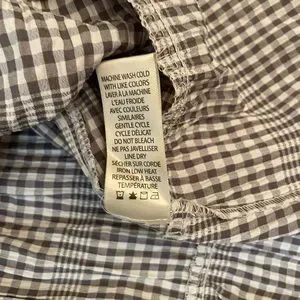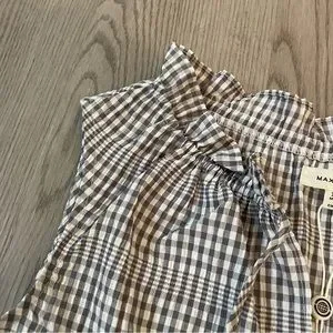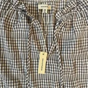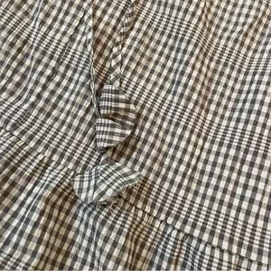 Gray and white gingham dress from Max Studio. Notched tie neck with ruffle trim and tie. Sleeveless. Tiered skirt hits around the knee.