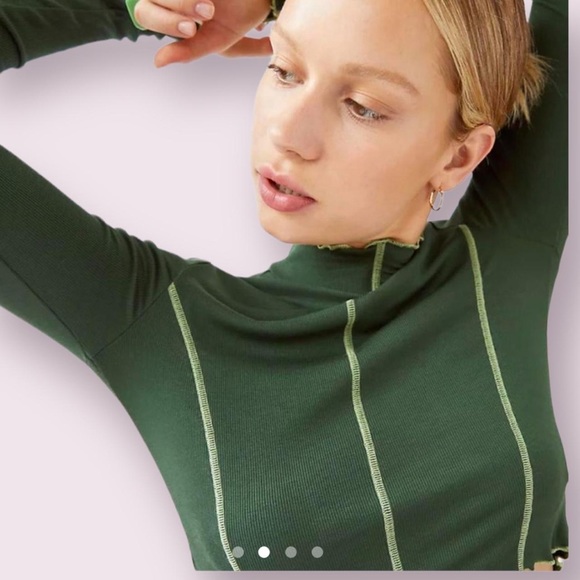 Recommended for M-L. From the website: “This is a cropped, mock-neck longsleeve with princess seams, lettuce edges and contrast-stitch detailing.” It’s also sold out in every size online.