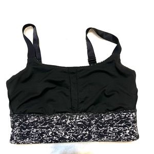 Long line sports bra with a beautiful black and white pattern, adjustable straps, and sweat wicking material.