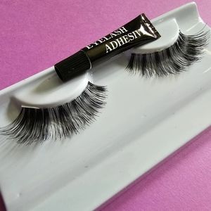 Each pack comes with adhesive, and the eye lashes are reusable.