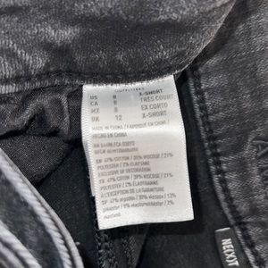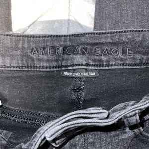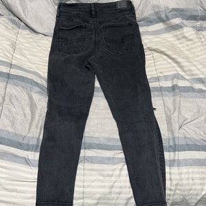 Good used condition American Eagle super hi-rise jeggings. Color is black, but is almost more of a very dark gray. No stains, holes, or tears other than intentional destruction. Smoke free home. Size 8 x-short.